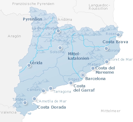 Die region katalonien liegt nordöstlich der iberischen halbinsel katalonien grenzt im norden an frankreich und andorra und im westen liegen die regionen spaniens aragonien und valencia.
